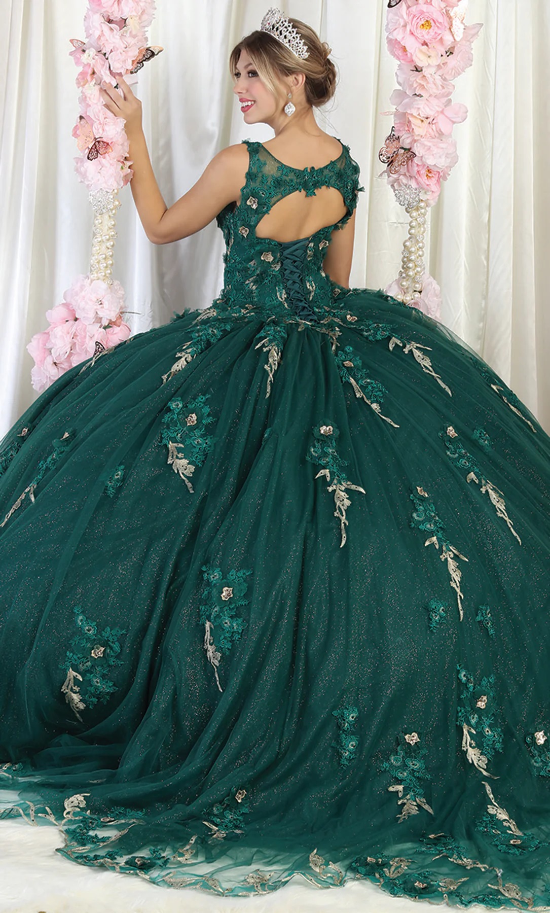 Vestido de 15 años de tiras espalda descubierta decorado con apliques y flores en 3D en tela de glitter falda corte princesa