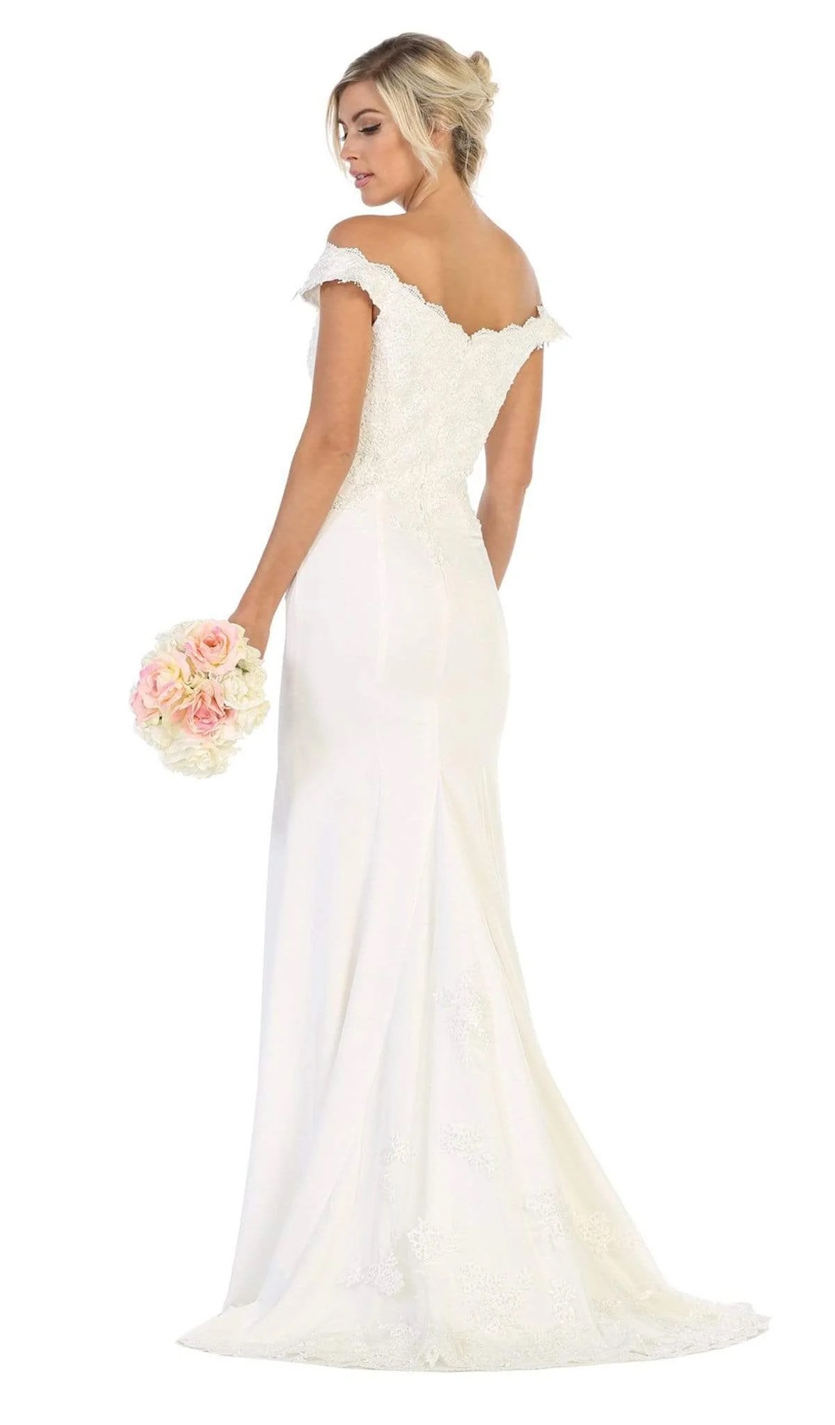 Vestido de Novia Off Shoulder ajustado color Blanco decorado con apliques