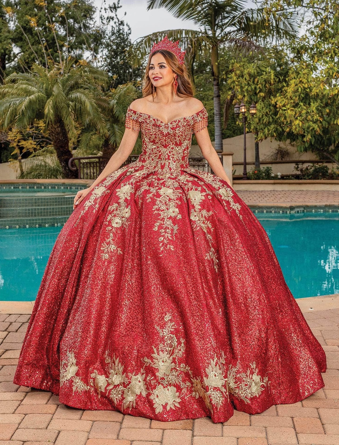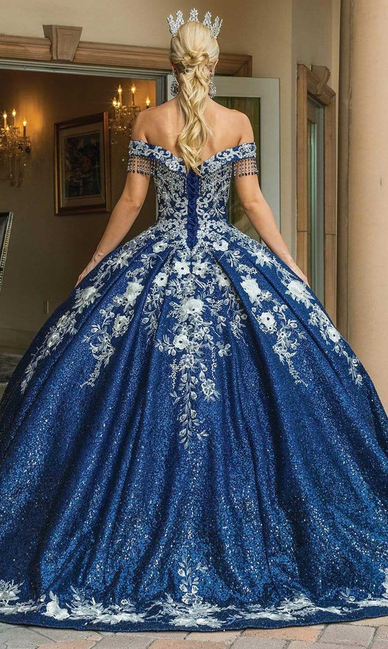 Vestido de 15 años Off Shoulder en tela de Glitter con apliques dorados y pedrería