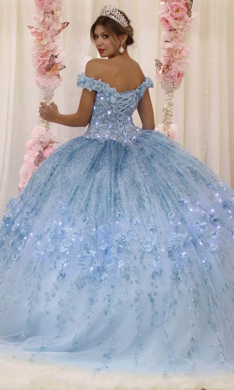Vestido de 15 años Off Shoulder decorado con apliques y flores en 3D en tela de glitter falda corte princesa con luces LED