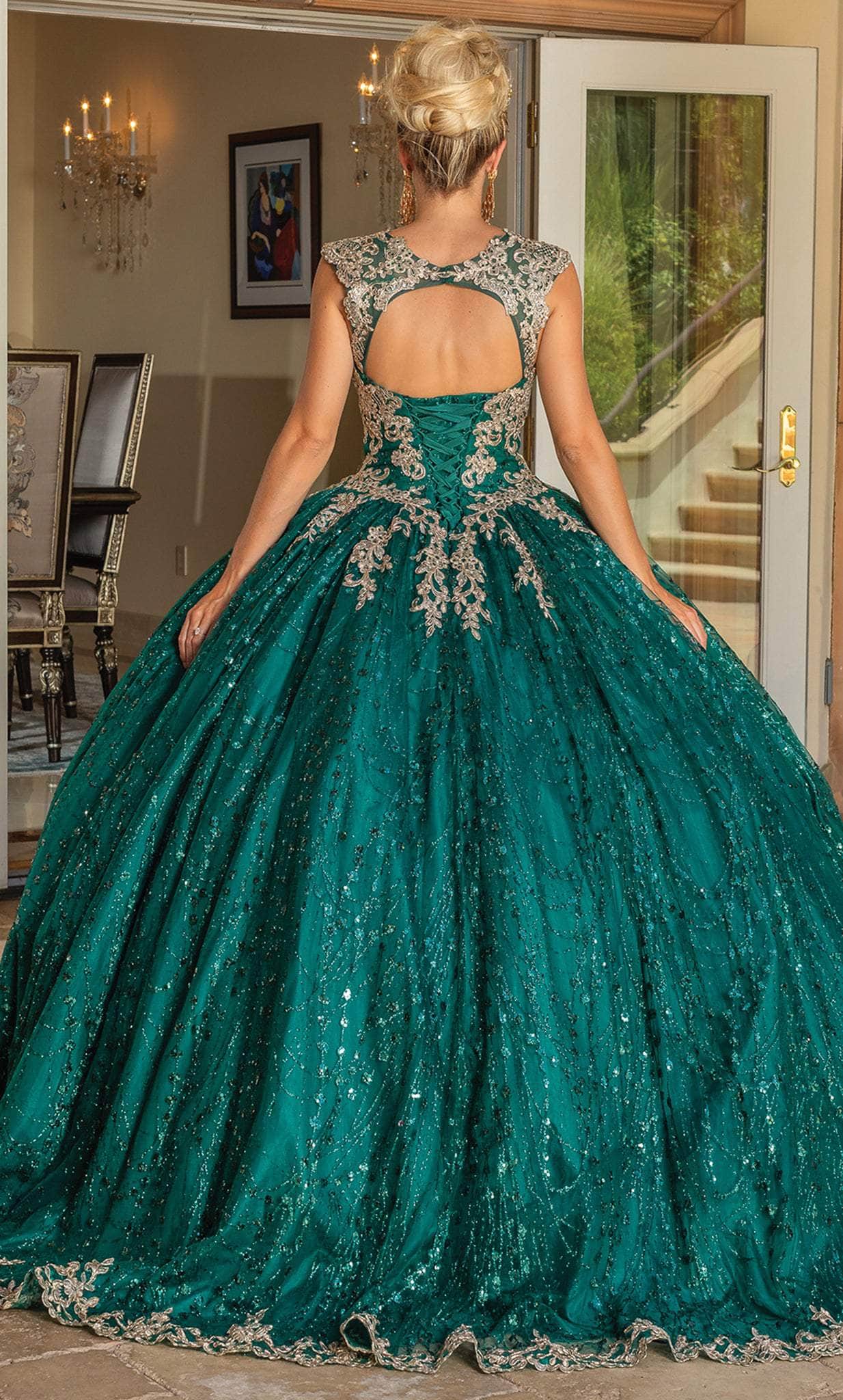 Vestido de 15 años Off Shoulder decorado con apliques dorados y falda corte Princesa