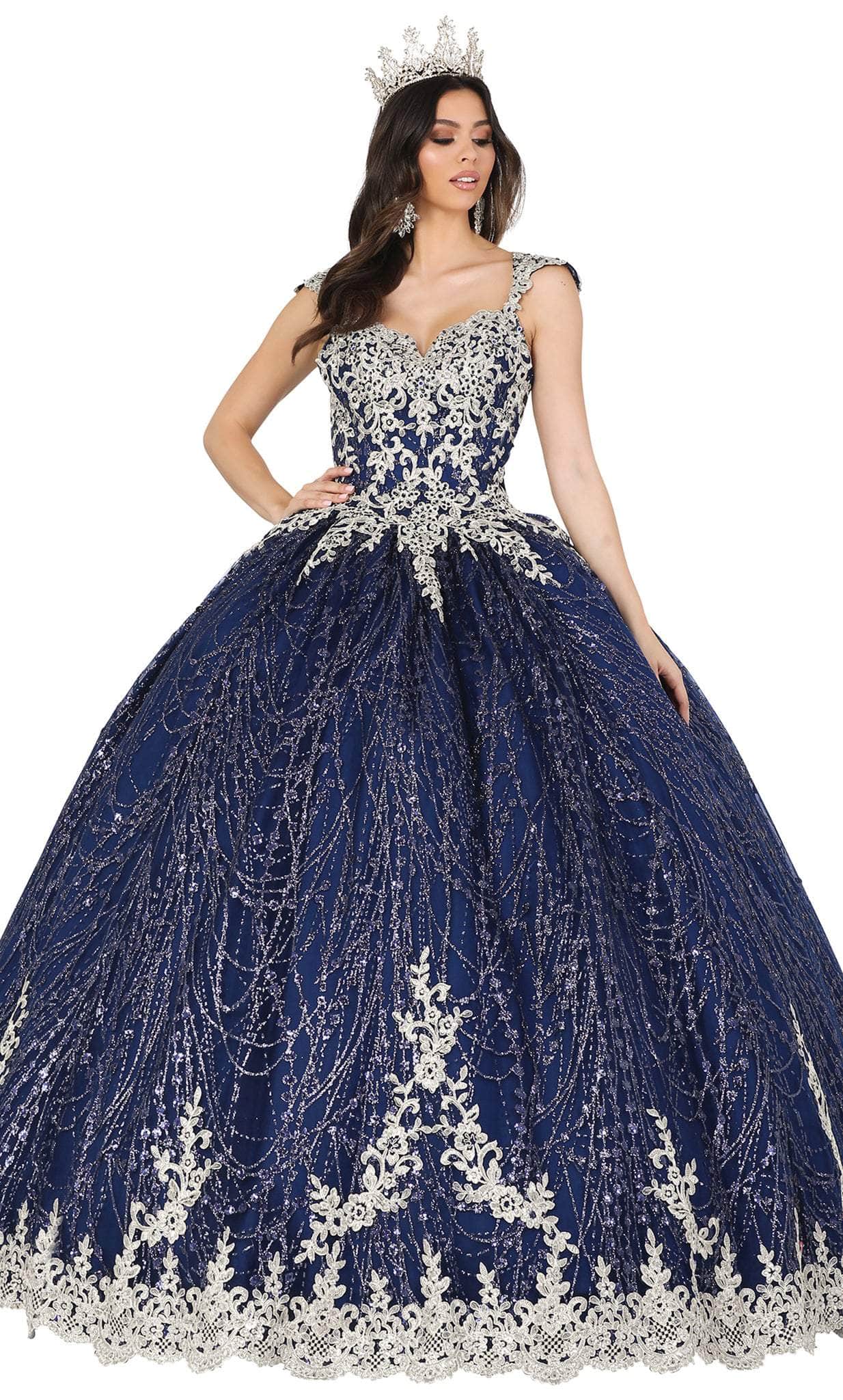 Vestido de 15 años color Azul Navy de tiras espalda descubierta decorado con apliques y pedreria plateada, falda corte princesa