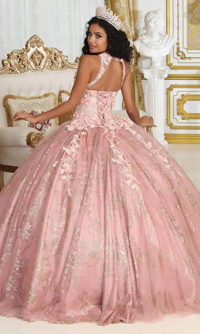 Vestido de 15 años color Rosegold Cuello Halter decorado con apliques y pedreria, falda corte princesa