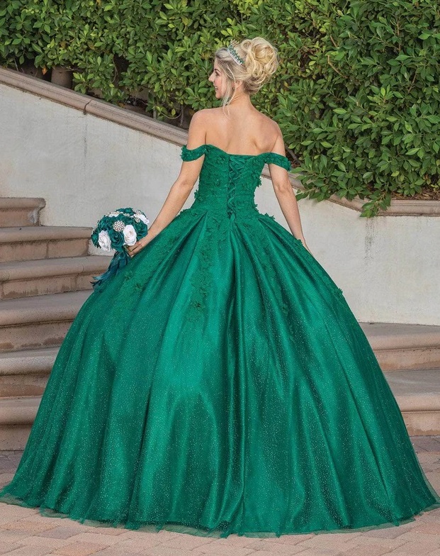 Vestidos de 15 años off shoulder decorado con flores en 3D y Glitter, falda corte Princesa
