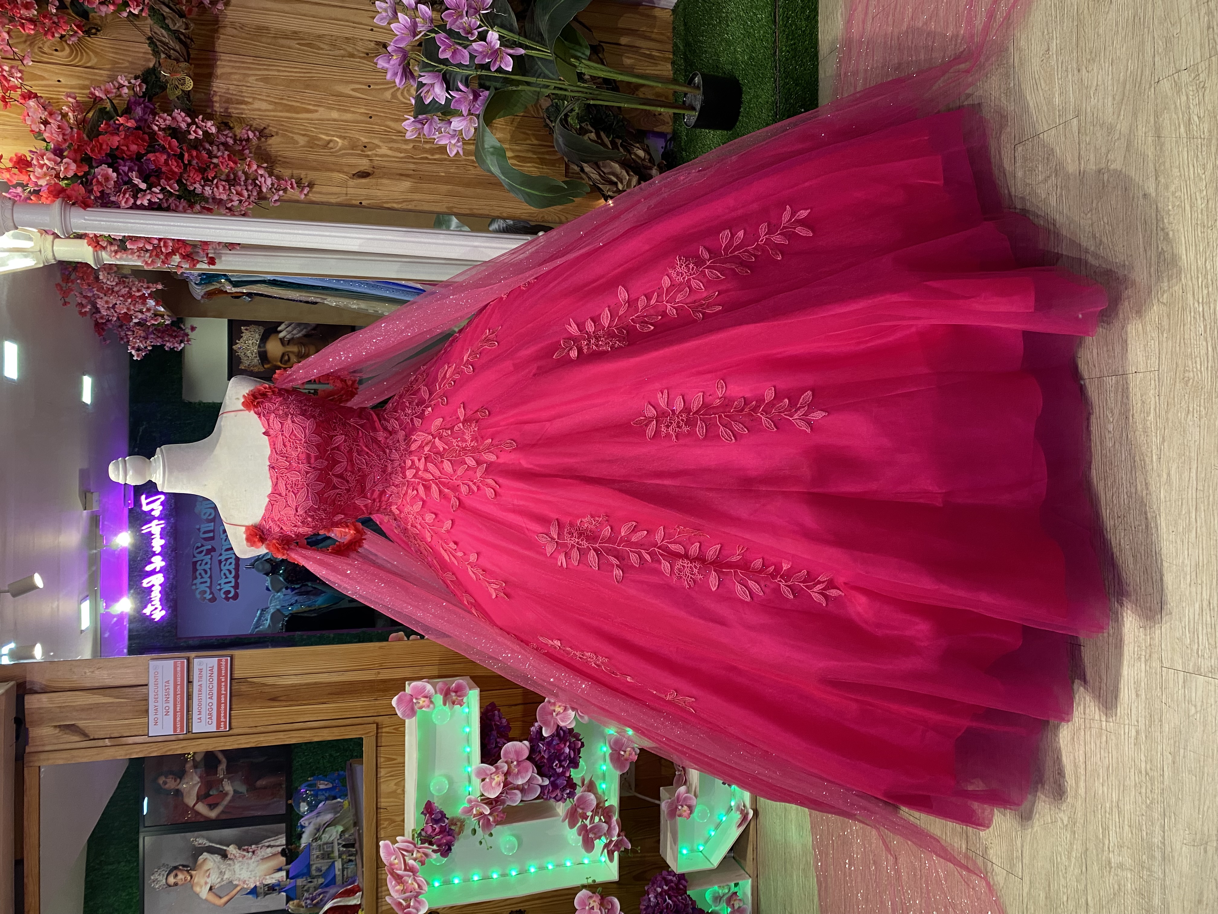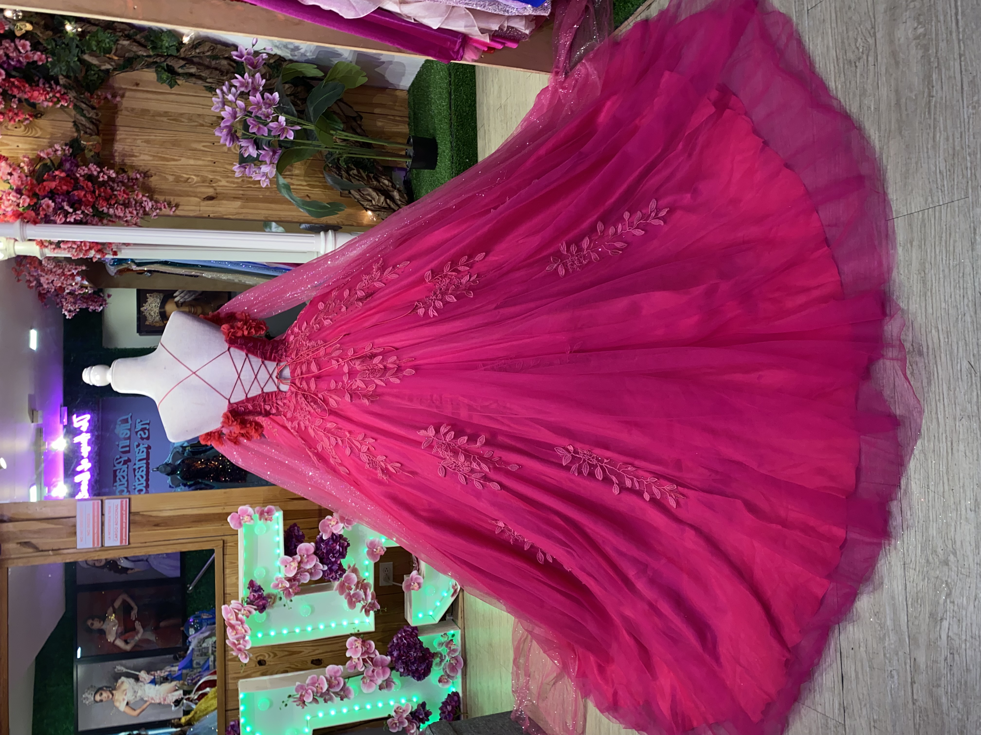 Vestido de 15 años decorado con apliques de flores y pedreria en Top, falda corte Princesa