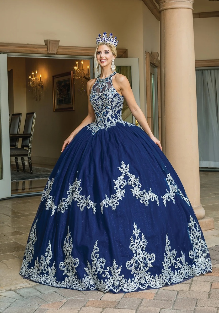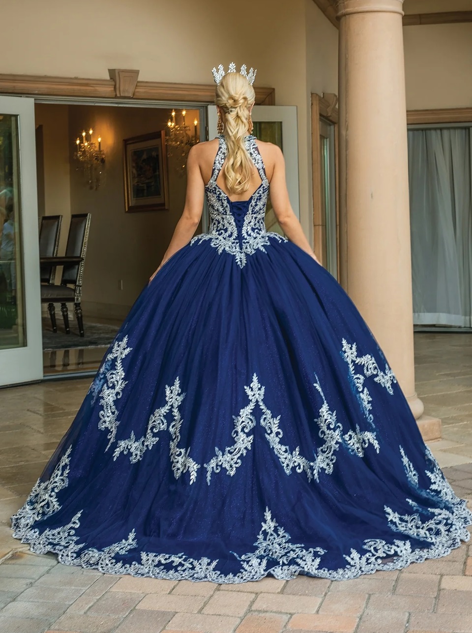 Vestido de 15 años cuello Halter decorado con apliques plateados y falda corte Princesa