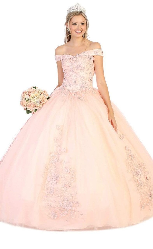 Vestido de 15 años Off Shoulder en tela decorada con apliques de flores en 3D y pedreria en Top, falda corte Princesa con cola