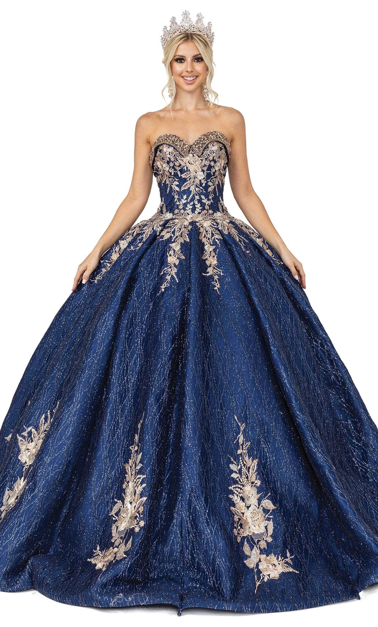 Vestido de 15 años color Azul Navy Strapless decorado con apliques y pedreria en tela de glitter, falda corte princesa