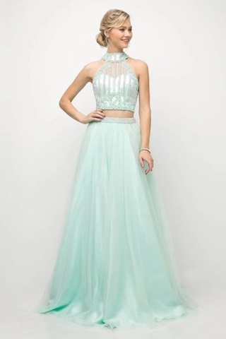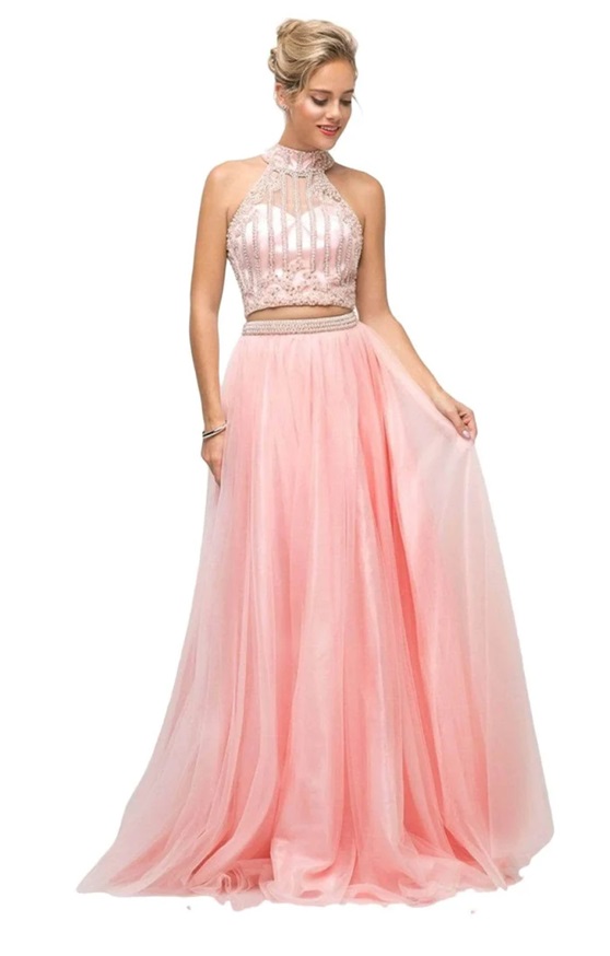 Vestido de 15 años cuello Halter con Pedrería en Top y falda corte Princesa
