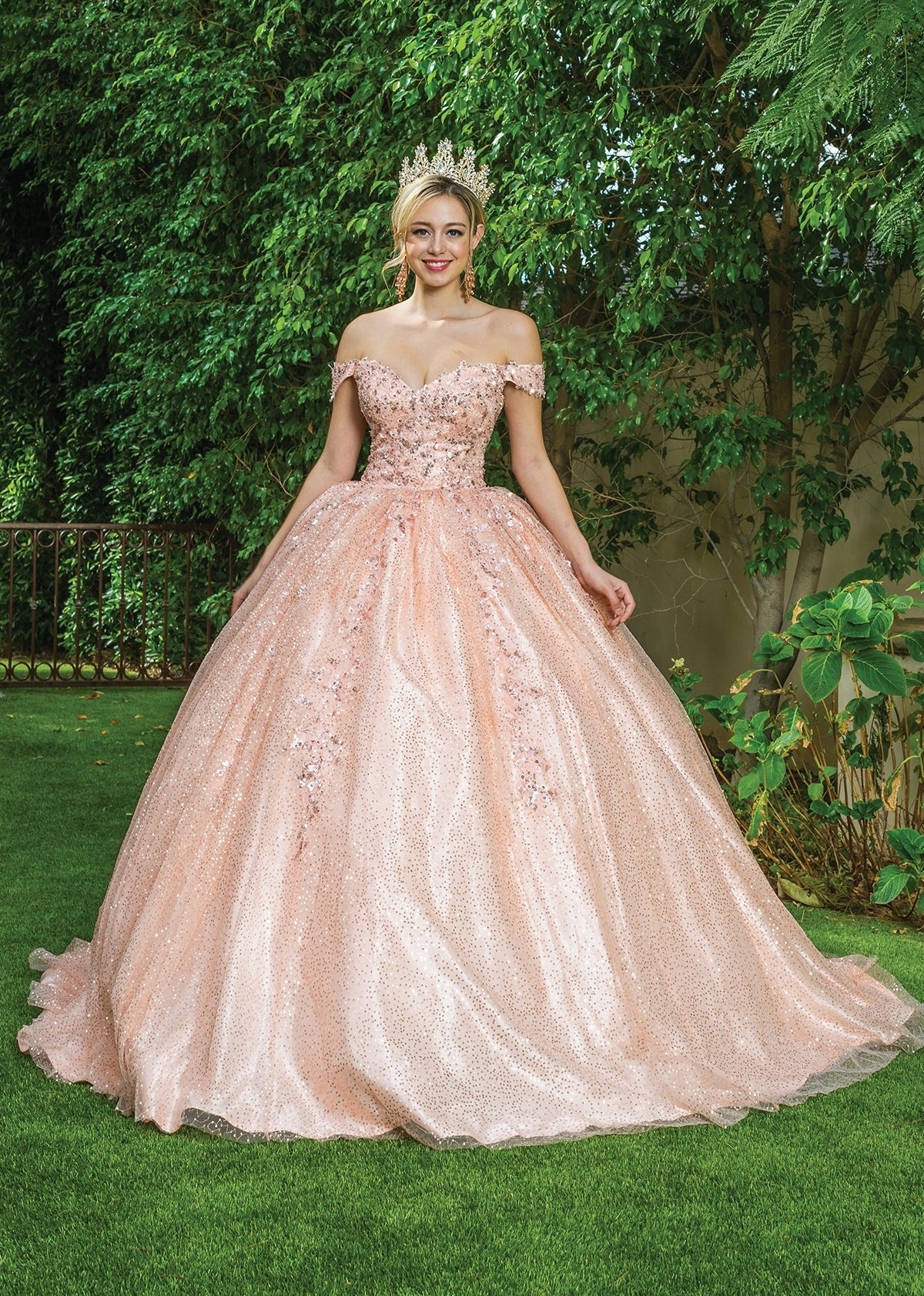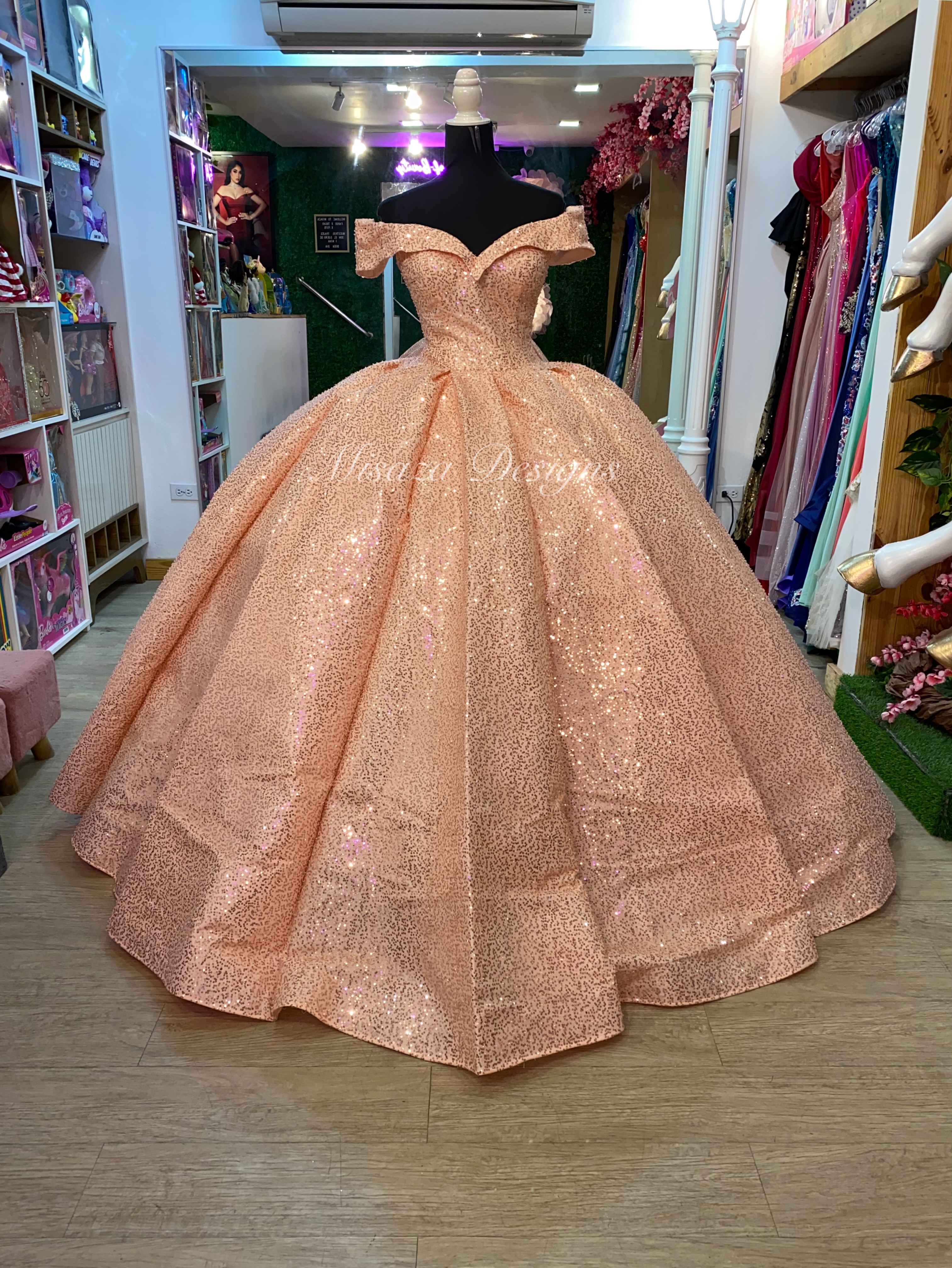 Vestido de 15 años Off Shoulder en tela de lentejuelas con pedreria y falda corte Princesa