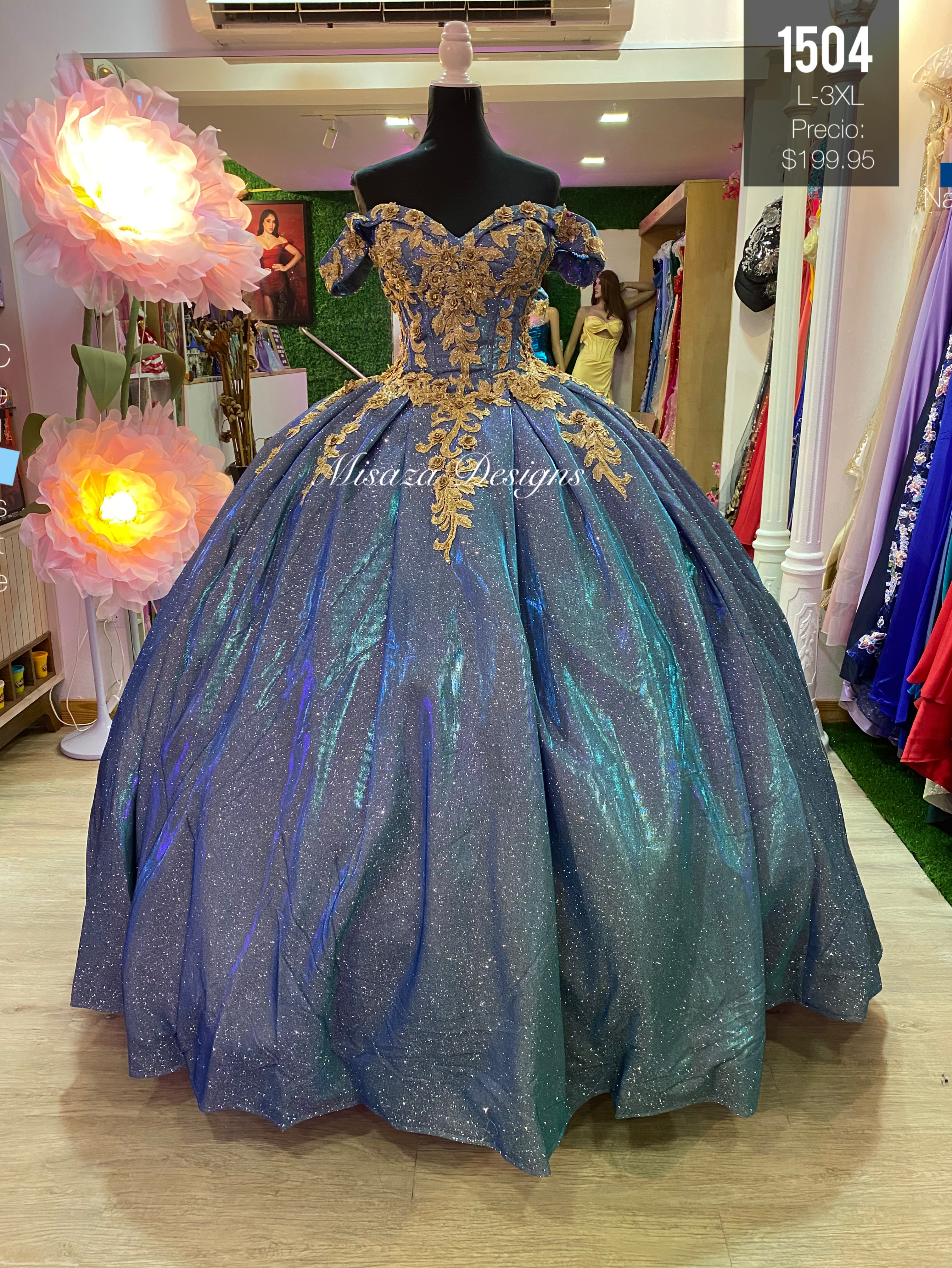 Vestido de 15 años Off Shoulder en tela de Glitter decorado con apliques dorados y falda corte princesa