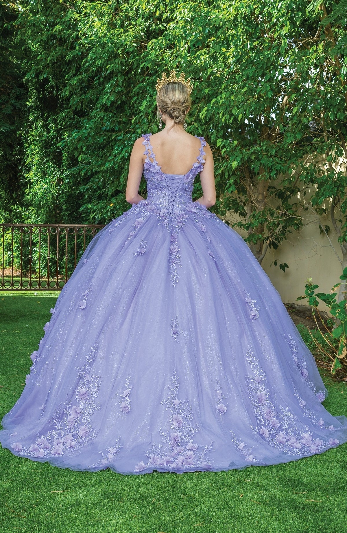 Vestido de 15 años color Lila decorado con Pedreria y finos apliques Lilas, falda corte princesa