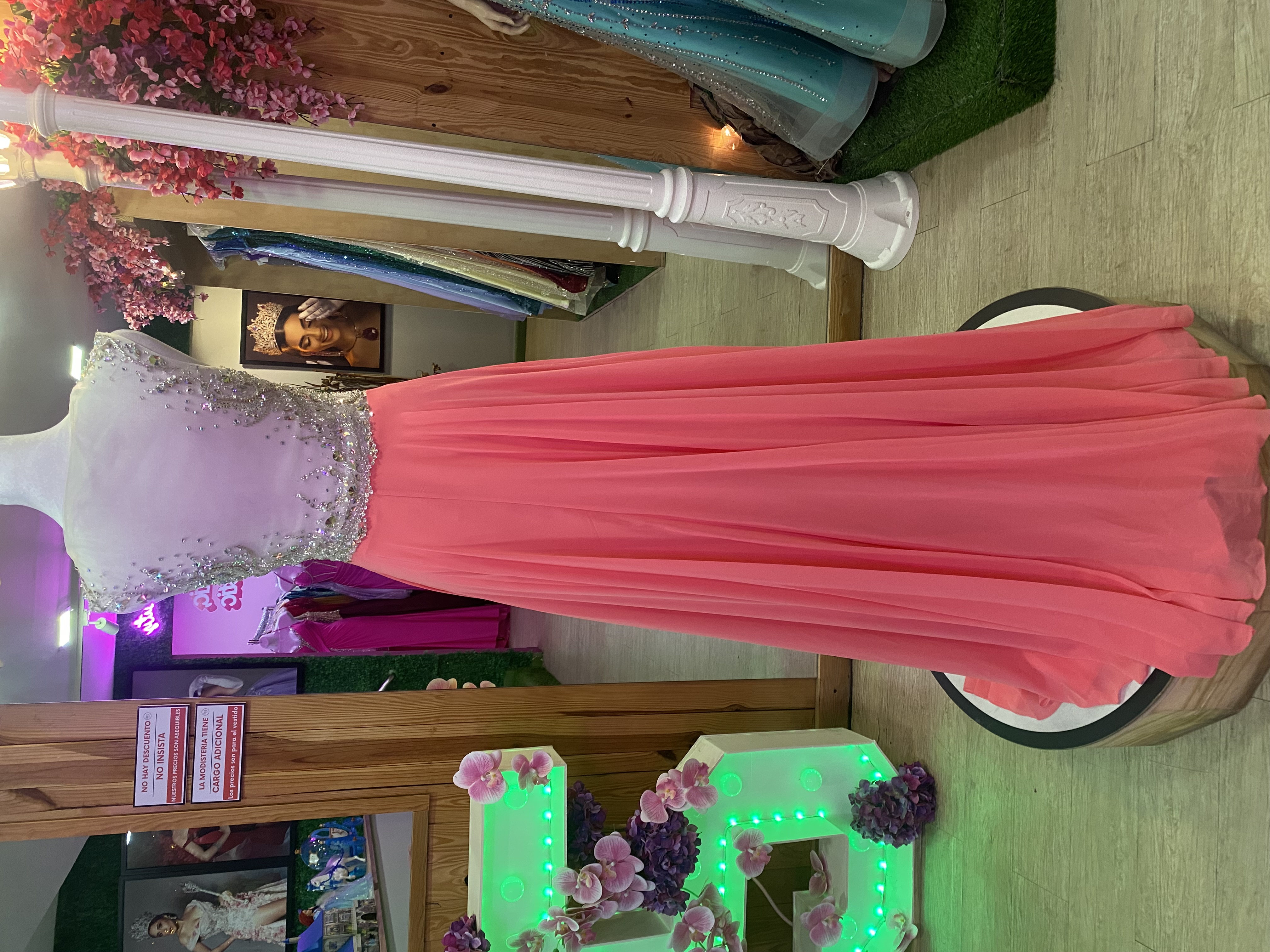 Vestido de gala Cuello Halter color Coral decorado con pedreria dorado y falda corte A