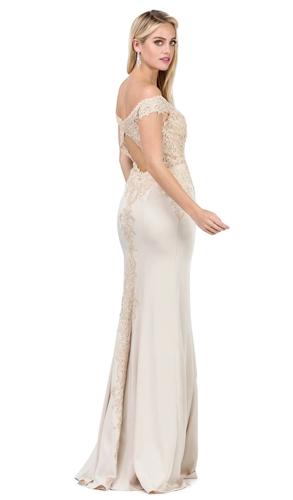 Vestido de Gala Off Shoulder, espalda descubierta decorado con apliques y pedrería en Top