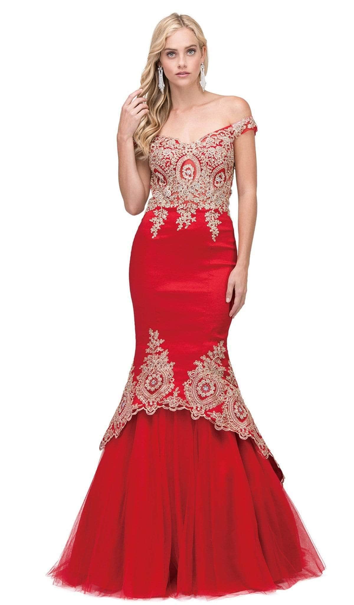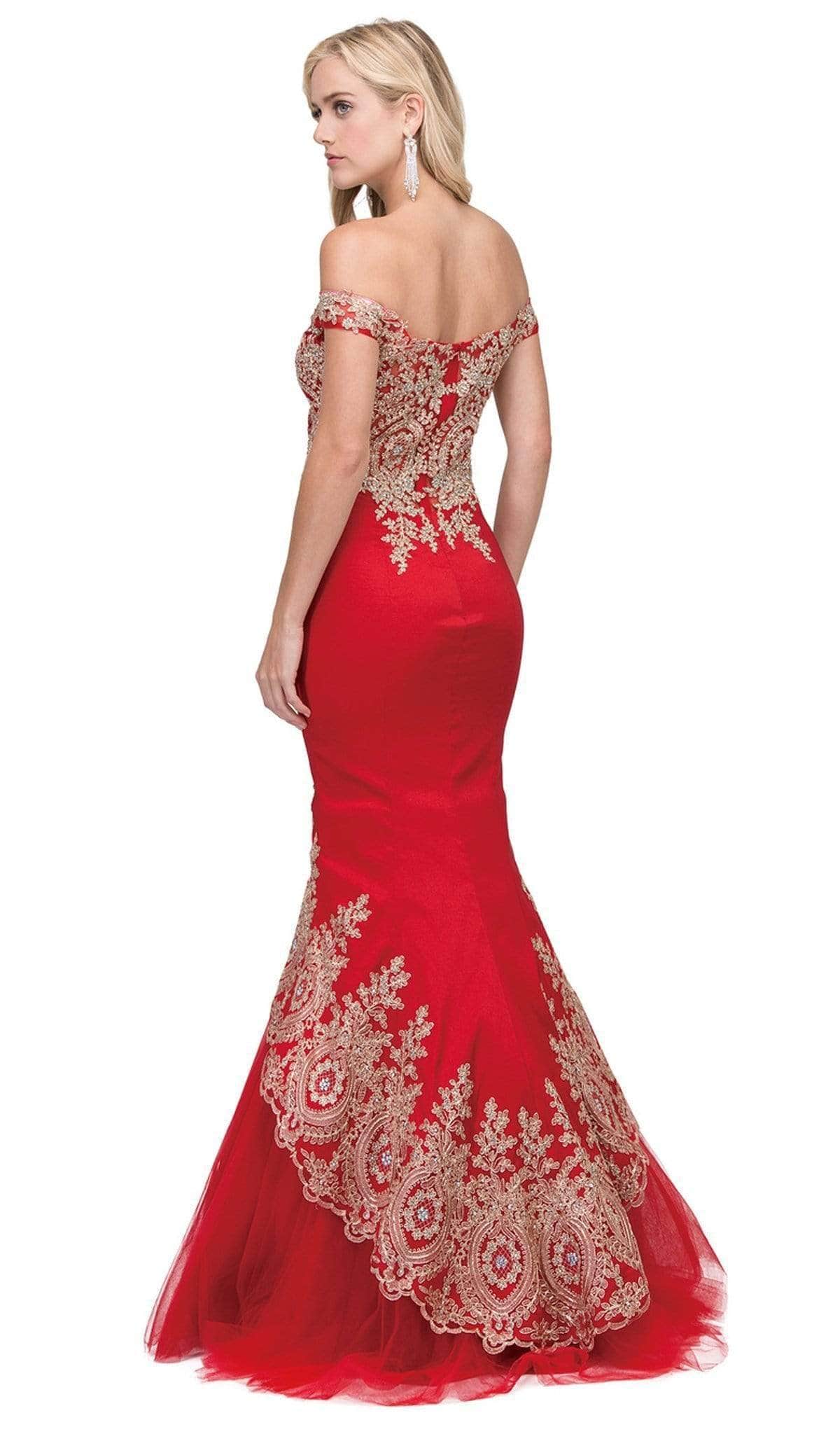 Vestido de Gala color Blanco pegado Off-Shoulder decorado con apliques dorados y falda corte sirena