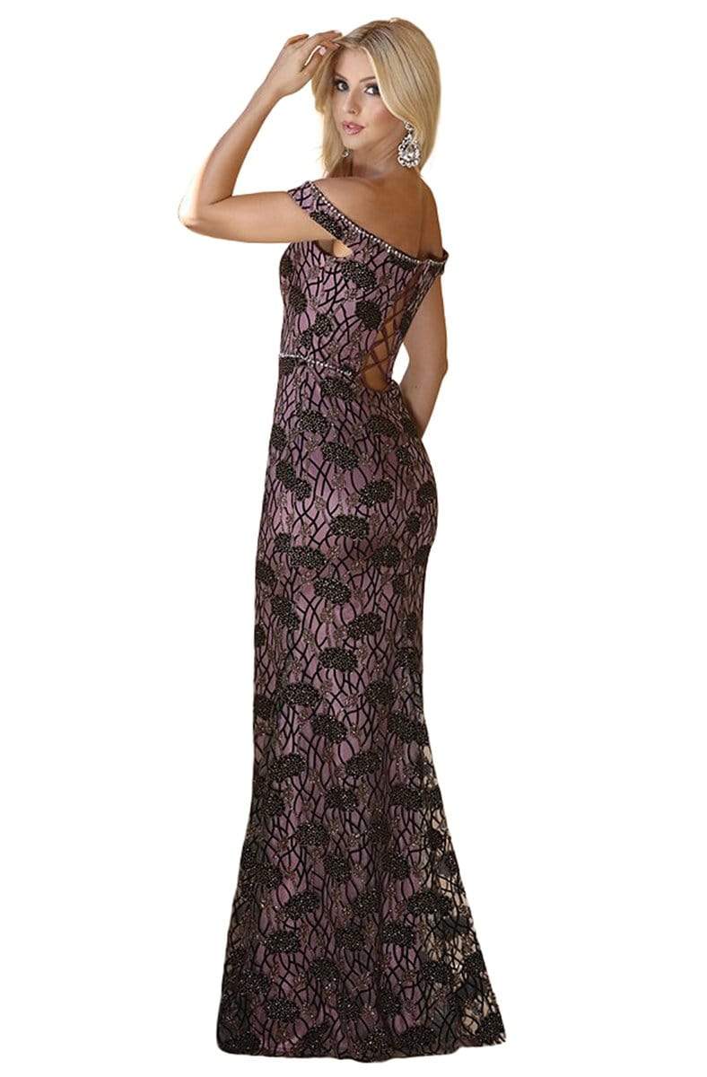 Vestido de Gala color Malva estilo Corset Off-Shoulder decorado con pedreria en top y apliques