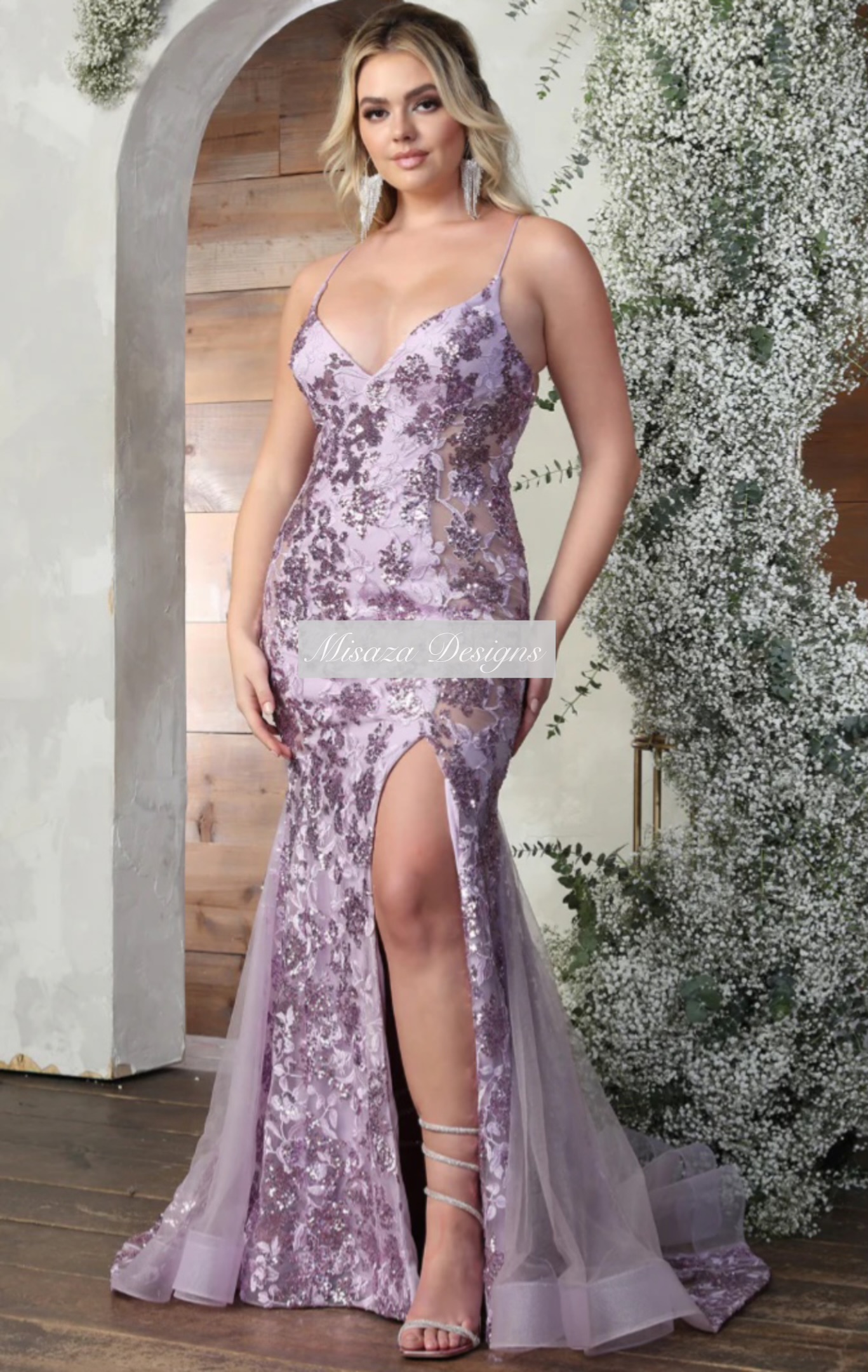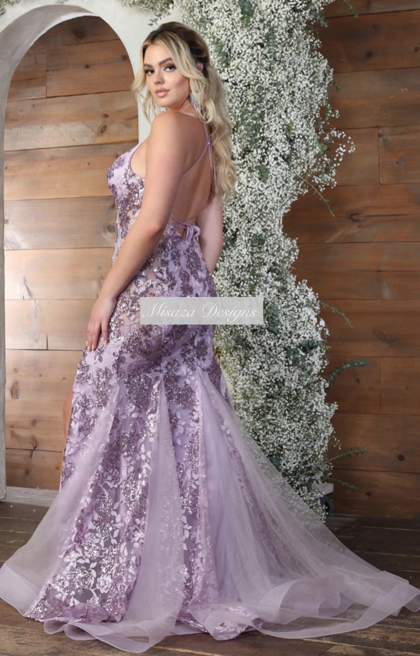 Vestido de Gala de tiras, decorado con apliques de Flores y semitransparencia en los costados, falda corte sirena con abertura lateral