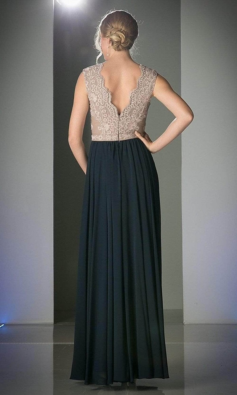 Vestido de Gala corte en V decorado con apliques en Top y falda corte A