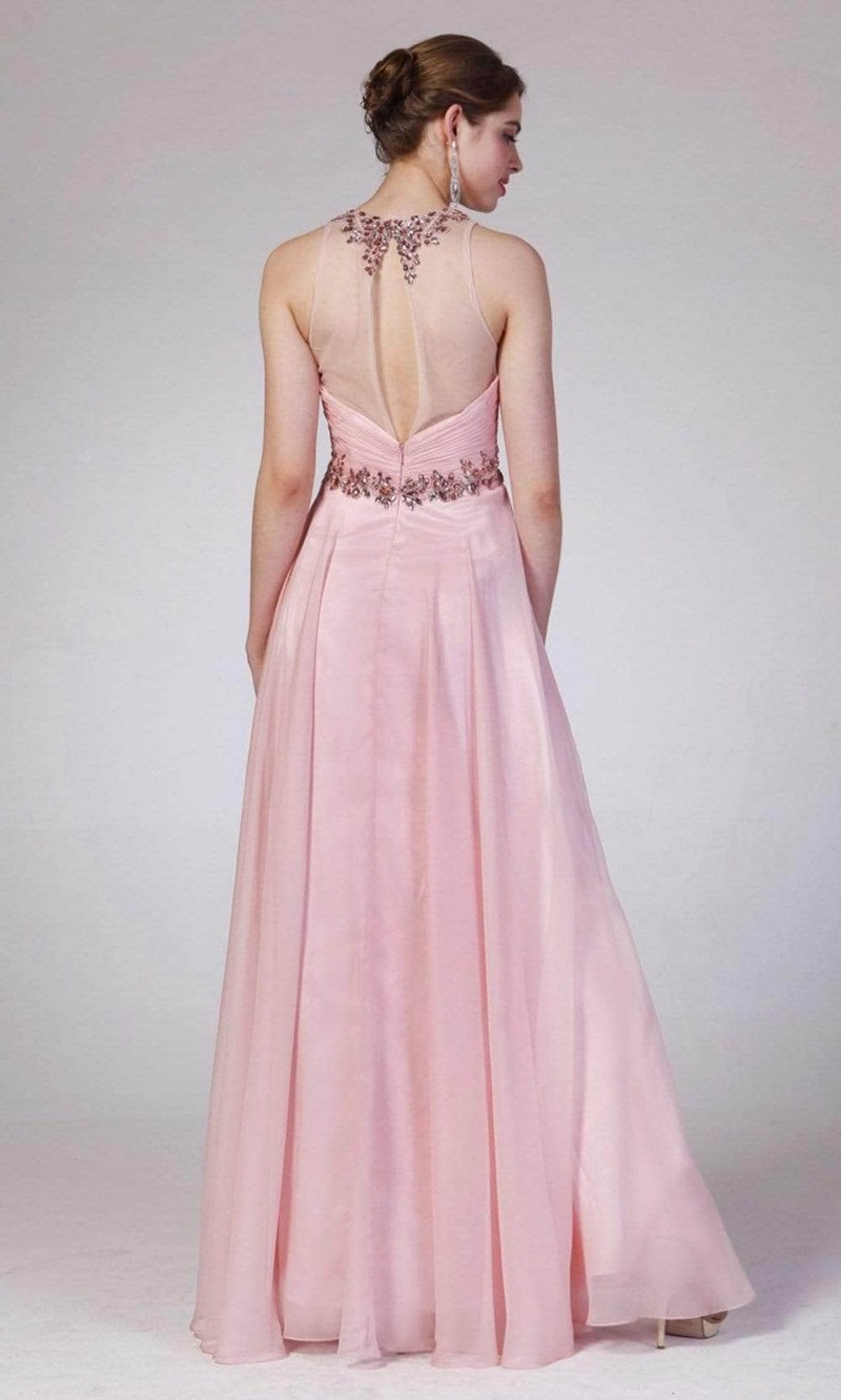 Vestido de Gala cuello Halter color Blush decorado con cristales de Rhinestone y canutillos en Top falda corte A