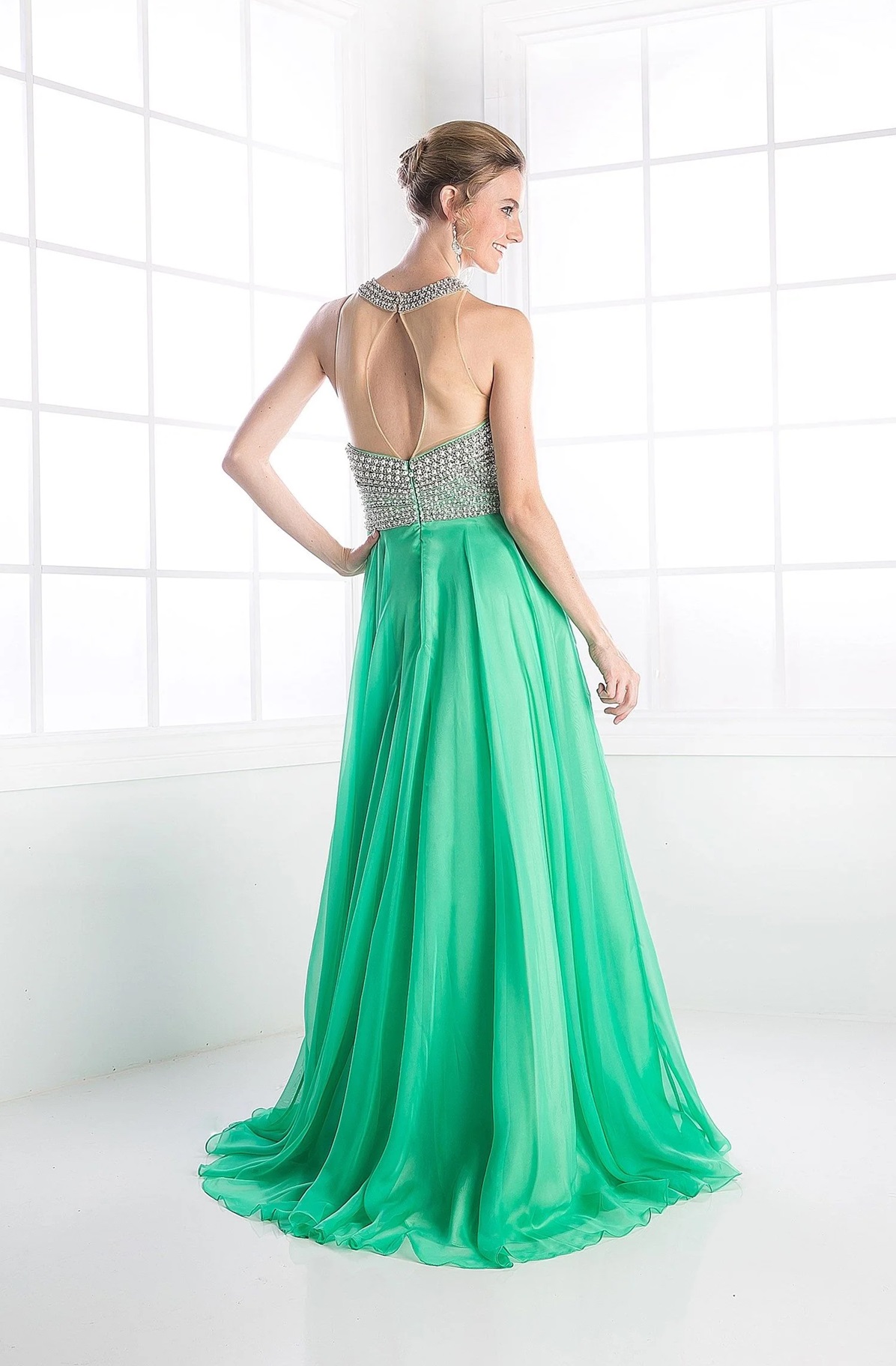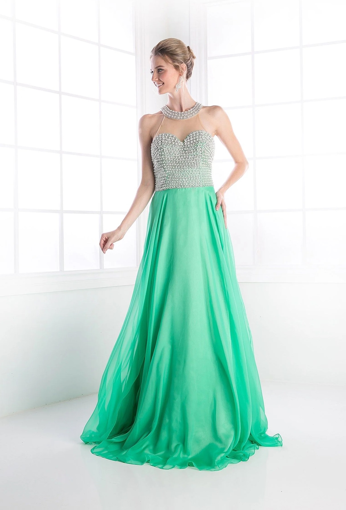 Vestido de Gala corte Halter color menta aplicaciones de cristal y rhinestone en top