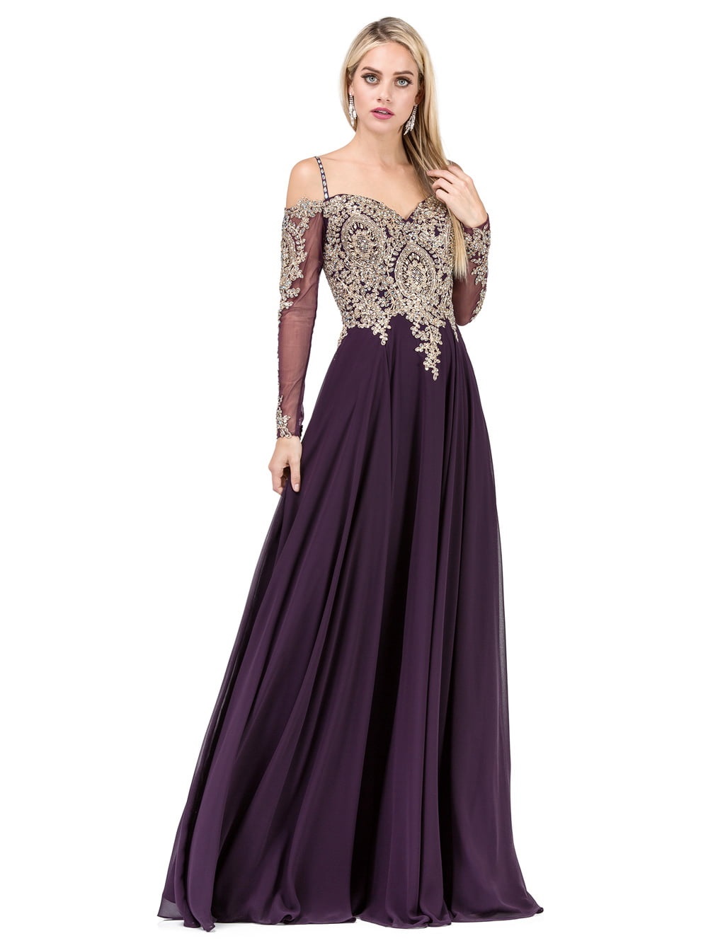 Vestido de Gala color Morado Off-Shoulder manga larga semi-transparente decorado con pedreria y apliques en top