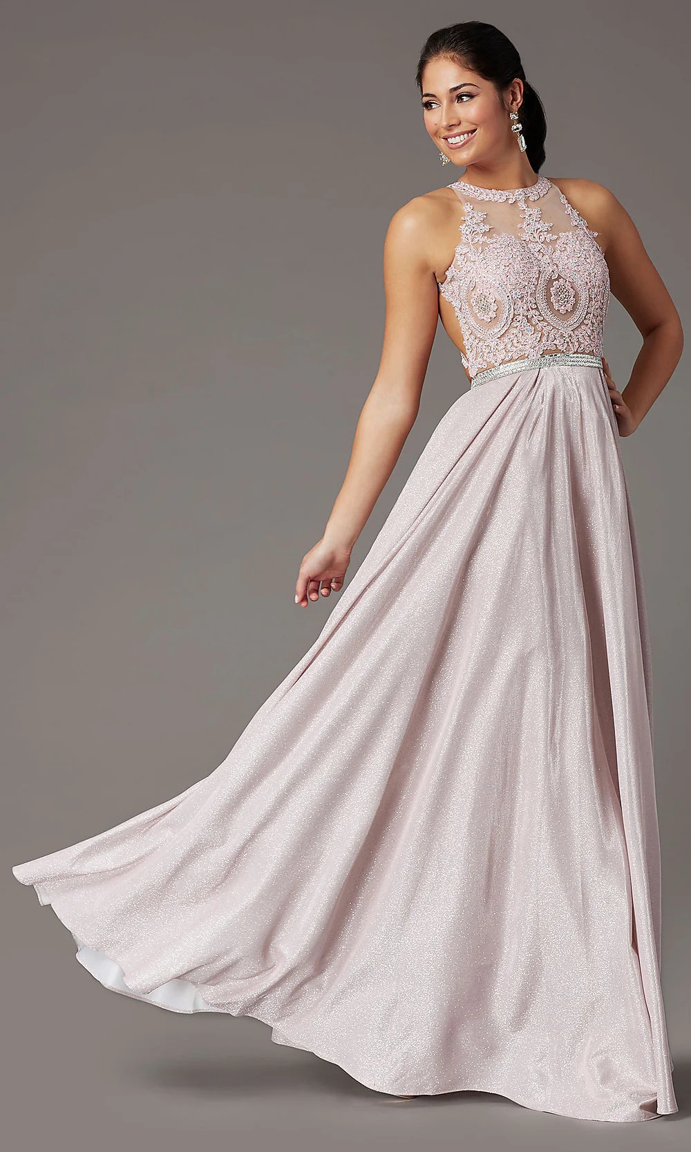 Vestido de Gala cuello Halter decorado con apliques en Top y falda corte A de Glitter