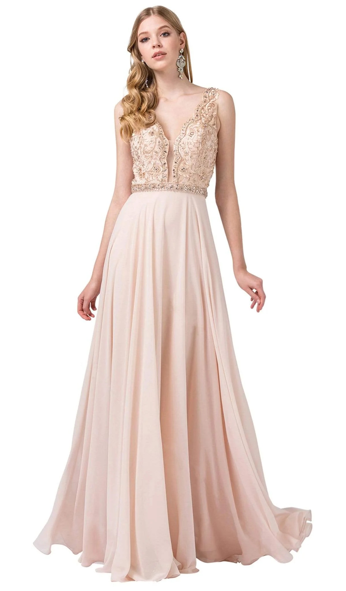 Vestido de Gala escote en V decorado con pedreria y apliques en Top, falda corte A