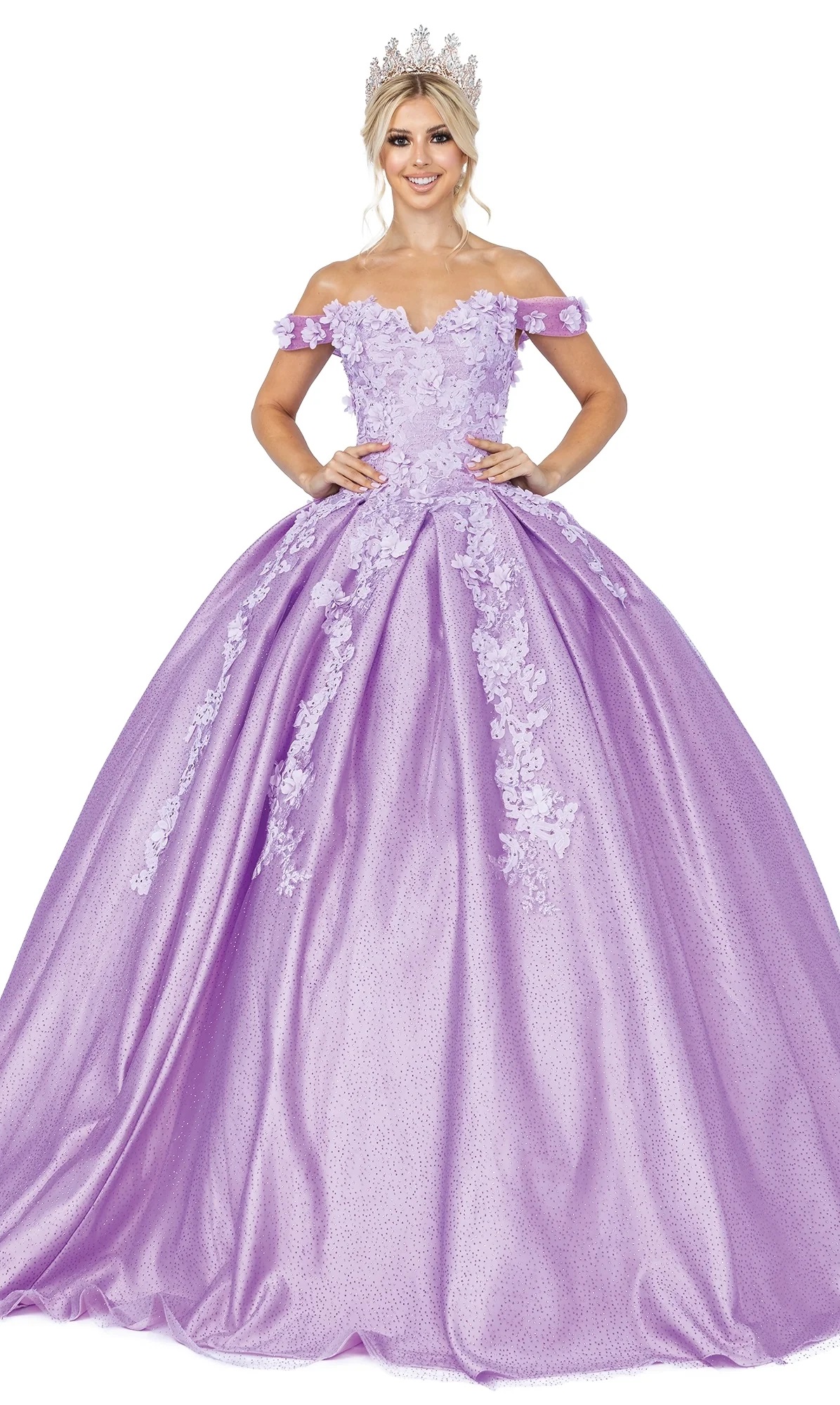 Vestido de gala color Dorado off shoulder decorado con glitter y apliques de flores doradas