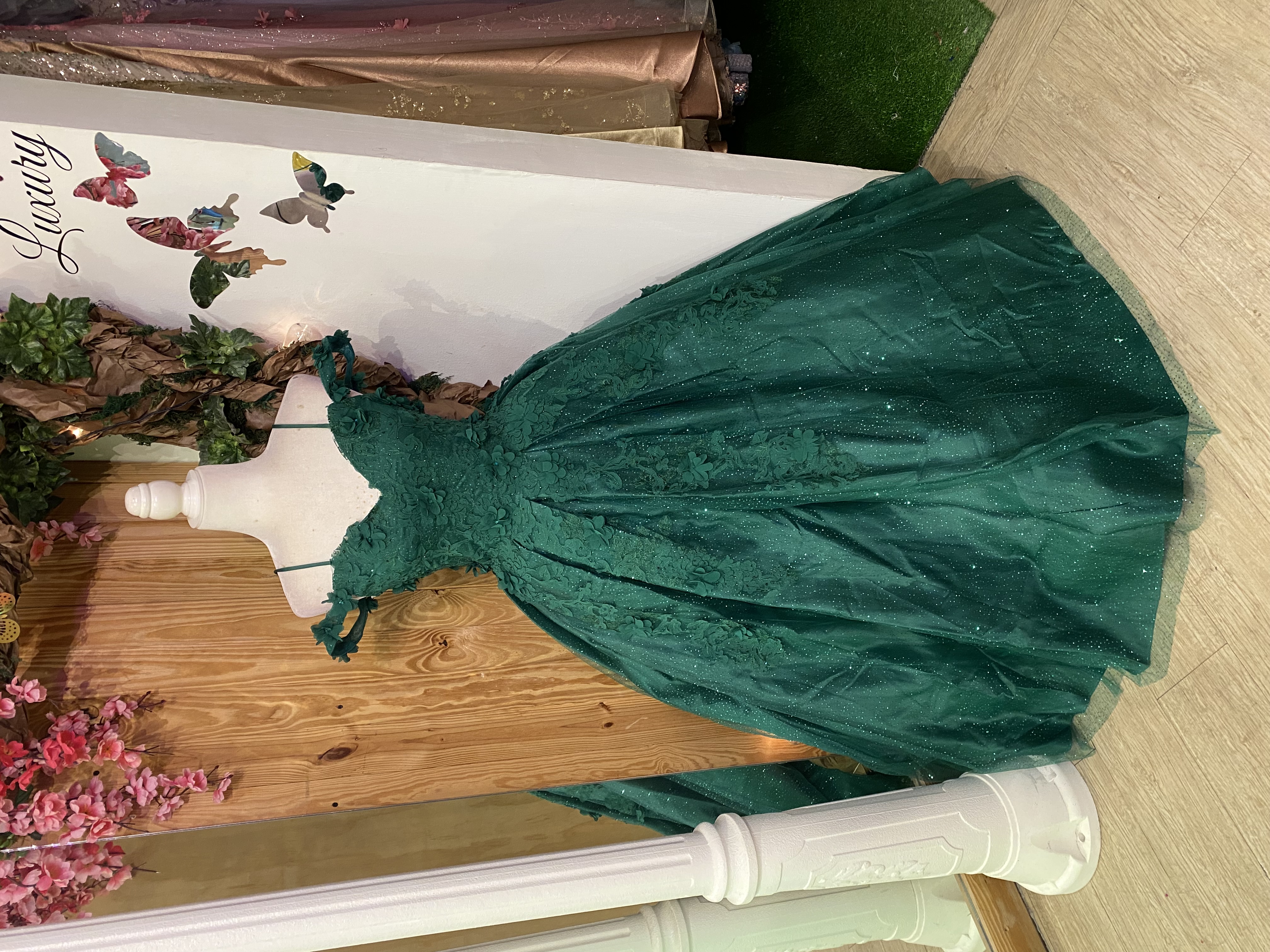 Vestido Petit corte princesa Off Shoulder en tela de Glitter decorado con apliques de Flores en 3D