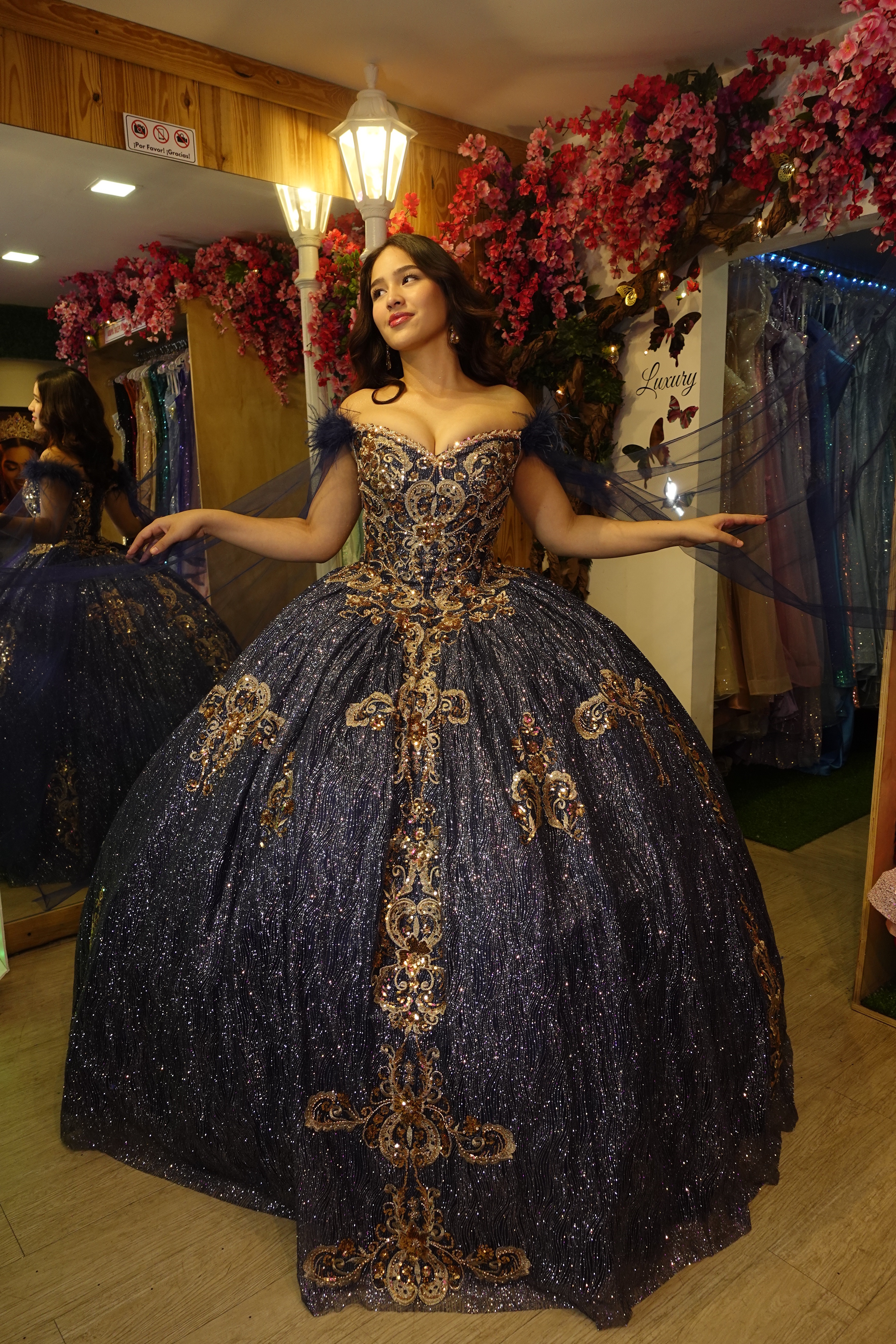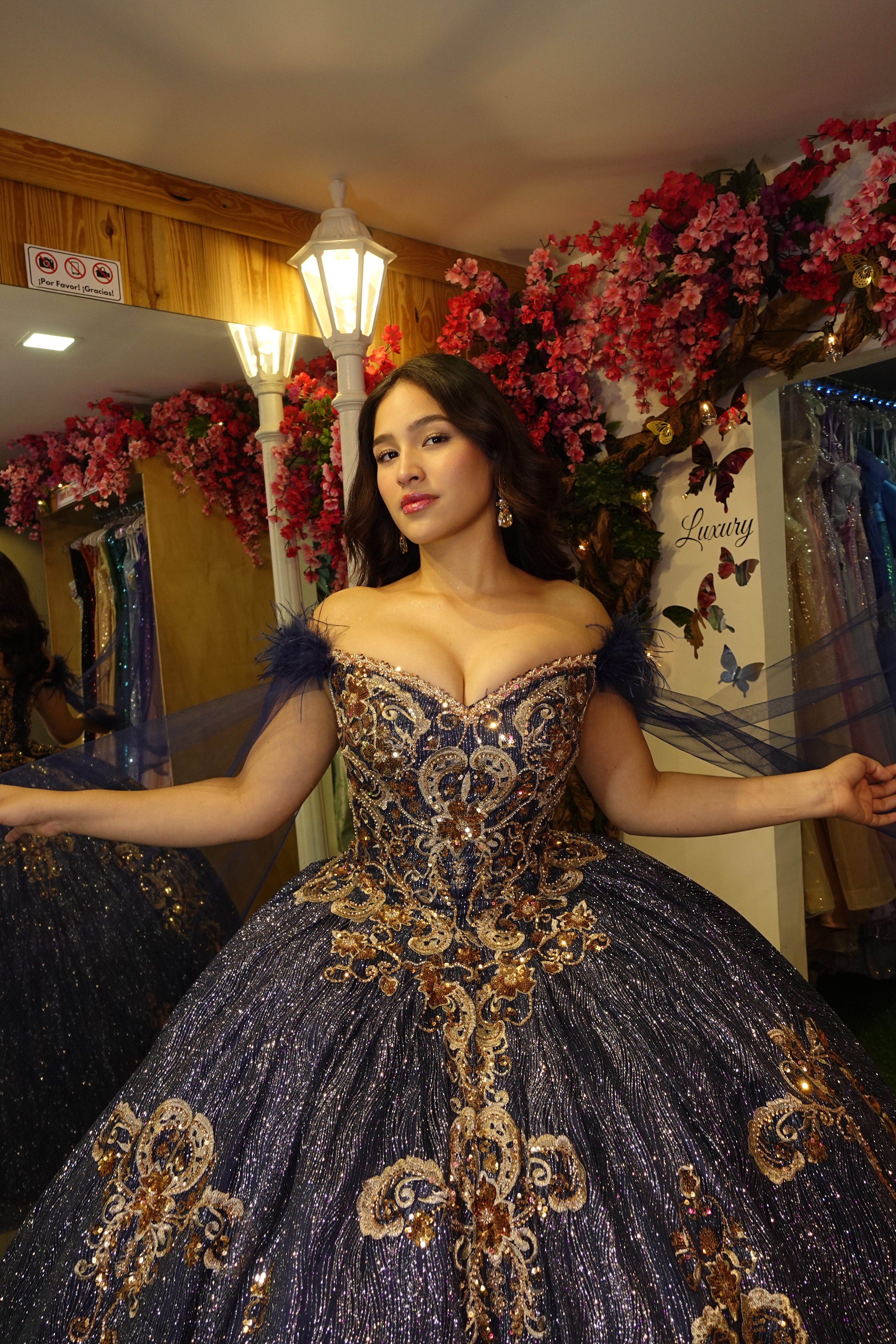 Vestido de 15 años Off Shoulder color Navy decorado con apliques y Glitter en dorado y capas en mangas con plumas
