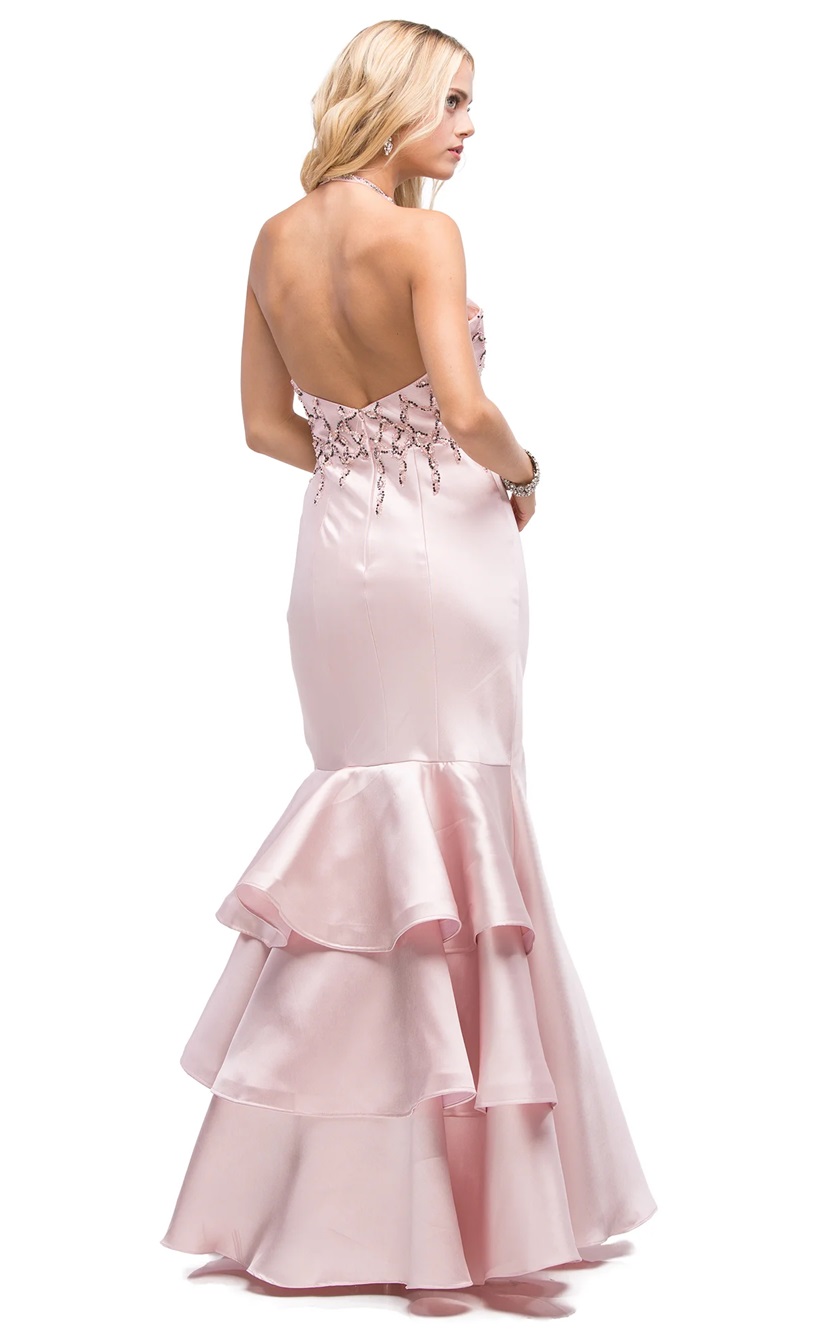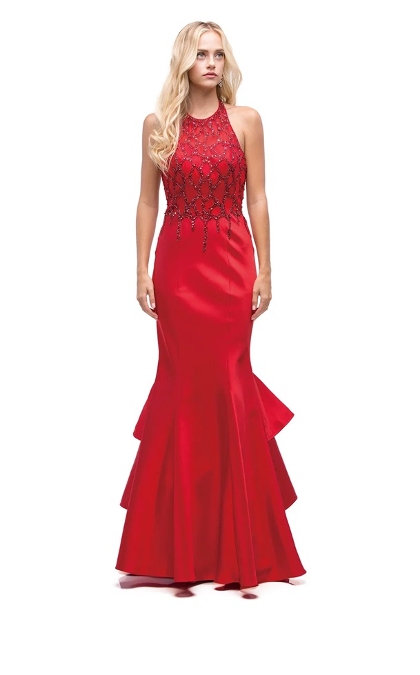 Vestido de Gala Cuello Halter ajustado decorado con pedreria en top y falda corte sirena