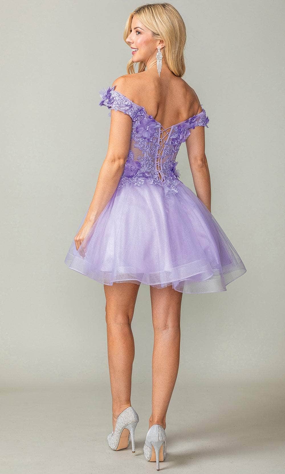 Vestido de 15 años corto Off Shoulder decorado con apliques de flores en 3D y falda corte A de Tul